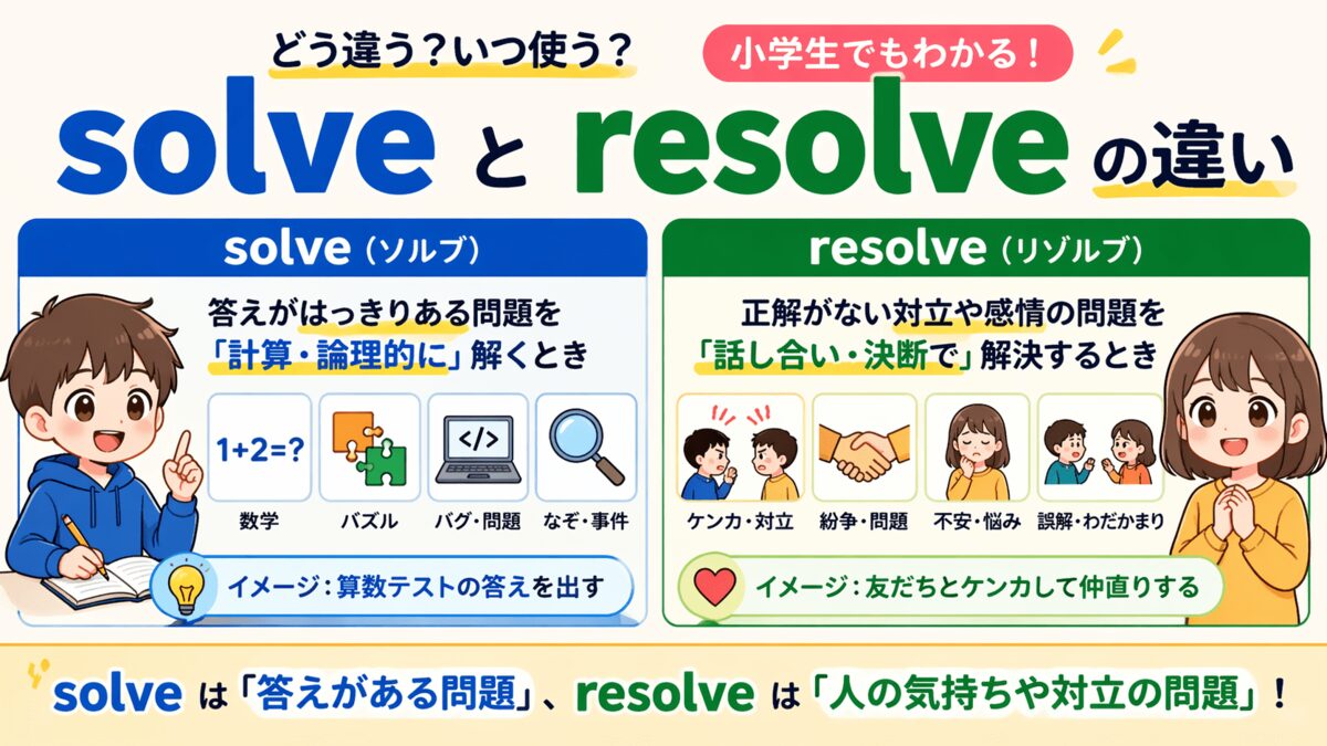 「solve = 算数テスト」「resolve = 仲直り」のイメージを持っておけば、多くの場面で自然に使い分けできます。日常会話やビジネス英語でぜひ試してみてください。