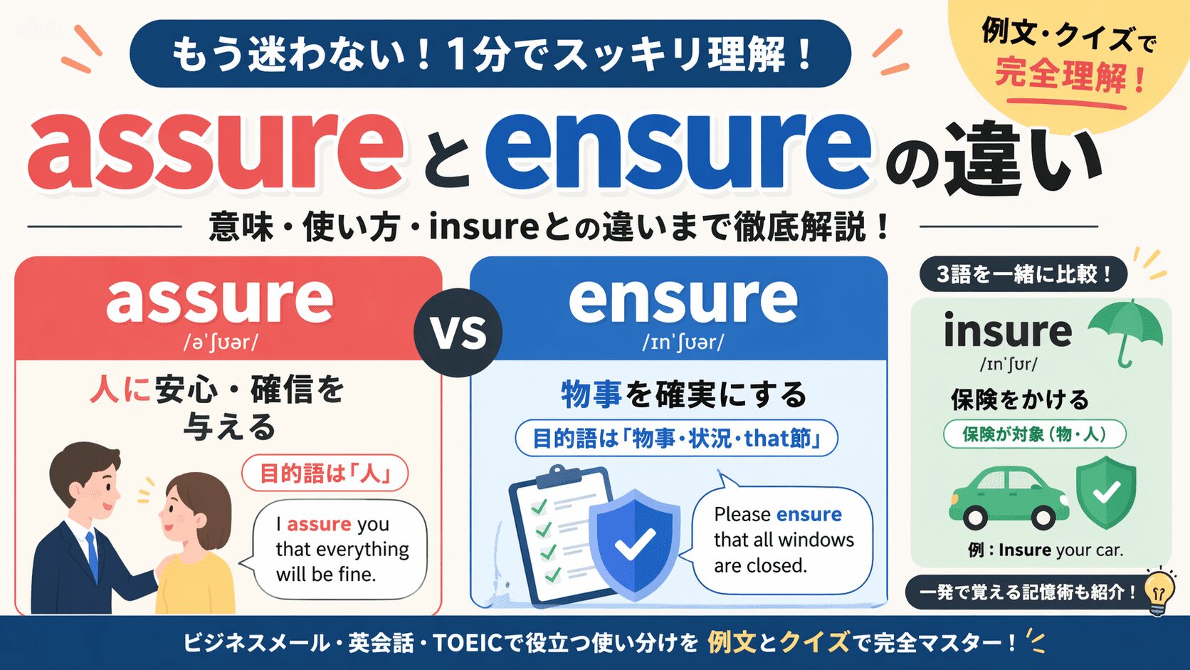 assure と ensure 違い|意味・使い方・例文とinsureとの違いまで解説